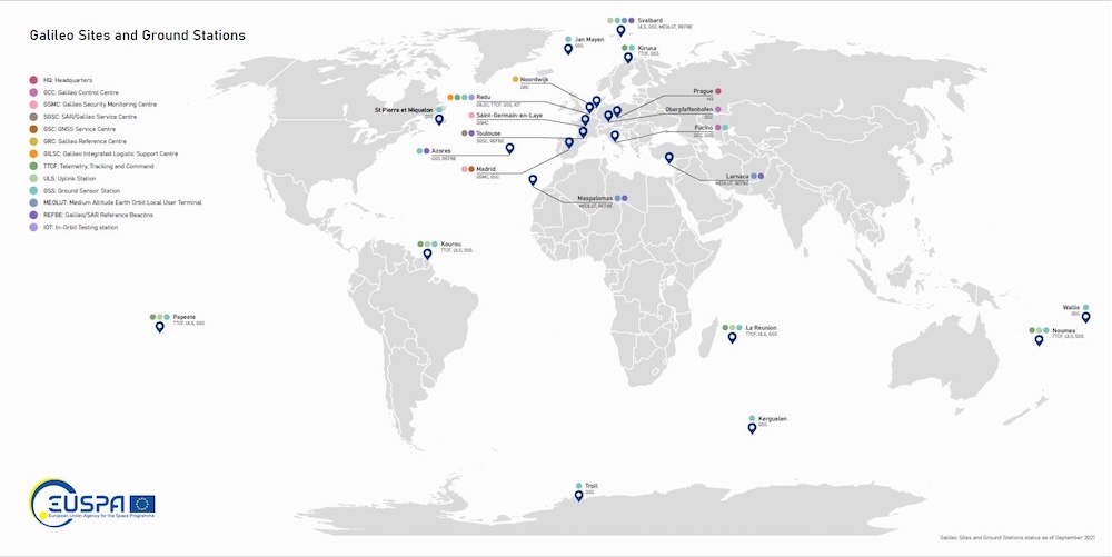 - Het grond-segment (de wereldwijde grondstations die de satellieten volgen, besturen en bijsturen),