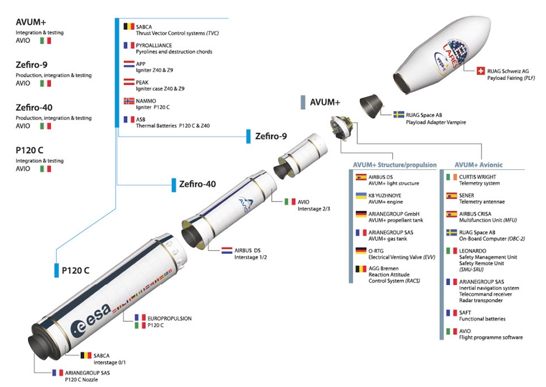 De Europese VEGA-raket bestaat uit vier trappen. De eerste drie trappen (P80, Zefiro 23 en Zefiro 9) gebruiken vaste brandstof en zorgen voor de krachtige opstijg- en klimfase. De vierde trap, AVUM (Attitude and Vernier Upper Module), gebruikt vloeibare brandstof (UDMH/N2O4) voor nauwkeurige baaninbrengingen en orbitale manoeuvres. De raket heeft een aerodynamische neuskegel die de lading beschermt tijdens de lancering. VEGA kan lichte tot middelzware satellieten (tot ongeveer 1,5 ton) in lage aardbanen brengen. De combinatie van vaste en vloeibare trappen geeft flexibiliteit, betrouwbaarheid en kostenefficiëntie, waardoor VEGA geschikt is voor wetenschappelijke en commerciële missies. Het project werd geleid door Italiaanse en Europese partners; Italië nam het grootste deel van de ontwikkeling voor zijn rekening, met belangrijke bijdragen van Frankrijk, Spanje, Nederland, Zwitserland, Zweden en België. VEGA (en de opvolger VEGA-C en toekomstige VEGA-E) bestaat uit drie vastebrandstoftrappen en een vloeibare bovenfase; belangrijke onderdelen zoals structuur, nozzle-sturing en avionica zijn geleverd door een Europese industriële keten.