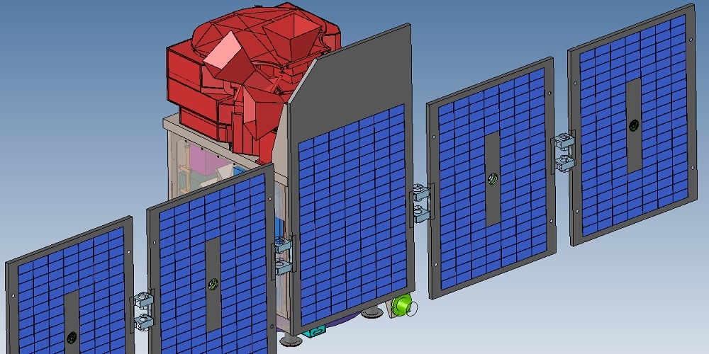 Artistieke impressie PROBA-ALTIUS met opengevouwen zonnepanelen