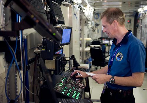 Frank De Winne aan het werk in het Japanse Kibo ruimtelabo - Foto: NASA